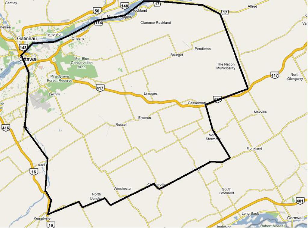 The northern boundary of the territory is the Ottawa River (although we do have some players come over from Gatineau). The east-west boundary line runs from the Ottawa River, south along Preston St to Dow's Lake. At that point the boundary follows the Rideau River south-west to Roger Stevens Dr and then continues south down to Highway 43. Everything EAST of the boundary is Gloucester territory and everything west of the boundary is Nepean territory. The Gloucester territory extends as far east as Rockland and as far south as Highway 43.